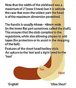 A wide variety of stick designs are allowed within the constraints of the rules of the game, the principal rule being that the stick must fit into a box of 100 mm × 50 mm × 350 mm (3.9 in × 2.0 in × 13.8 in) and that the stick must not be capable of surrounding the puck by any more than 50% of the puck's circumference, nor any part of the hand. A rule concerning the radiuses of projections and edges tries to address the risk that the stick might unintentionally become more of a weapon than a playing tool.