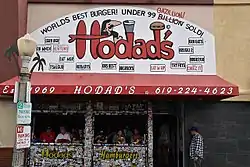 Hodad's has received positive reception for its burgers and style. It appeared on an episode of "The Best Thing I Ever Ate" on the TV channel Food Network.[30] The restaurant's bacon cheeseburger has been lauded by Guy Fieri, and in 2009 CNN included it on a list of "Five tasty burger joints worth visiting."[31] Hodad's was featured in one of San Diego Magazine's "Everyday Eats" articles, which covers budget food options.[32] In 2015 Foursquare ranked the restaurant 26th on its list of 50 "best burger joints in America."[11] In an article by Hoodline, Hodad's burgers ranked number 3 out of 50 for quality burgers under $10.[33] The San Diego Union-Tribune included it in its list of the 30 best burgers in San Diego.[21] Times of San Diego's Hoa Quach included it in a list of restaurants to celebrate Father's Day in San Diego.[25]