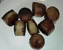 Hog's pudding is a type of sausage produced in Cornwall and Devon.[1] Popular variants of the recipe consist of pork meat and fat, suet, bread, as well as oatmeal or pearl barley formed into a large sausage—also known as 'groats pudding' and are very similar to a white pudding, whereas other versions of the recipe contain a high percentage of offal such as lung and liver and can more accurately be described as a sort of West Country haggis.[2] It is much spicier than white pudding as it contains black pepper, cumin, basil and garlic. The sausage is usually around two inches in diameter.