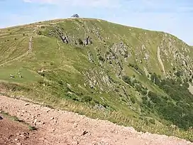 The Hohneck is, at 1,363 m (4,472 ft) the third highest summit of the Vosges Mountains (after Grand Ballon [1,424 m; 4,672 ft] and Storkenkopf [1,366 m; 4,482 ft]) and the highest point of Lorraine.[3] On its summit stands a mountain hut, clearly visible in the distance. Nearby the mountain's top is located the ski resort of La Bresse Hohneck.
