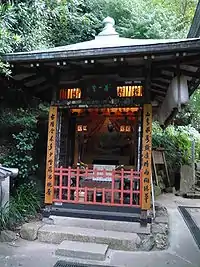 According to legend, Hoichi was a blind minstrel (or biwa hōshi) with an amazing gift for the biwa (a loquat-shaped Japanese lute).[4] He was particularly good at performing the Tale of the Heike, an epic describing the fall of Emperor Antoku, who is buried at Amidaji Temple. His performances were so wonderful that "even the goblins could not refrain from tears". Despite his talents, Hoichi was very poor and was forced to live at Amidaji Temple with a friendly priest.