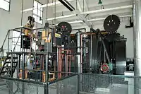 Drum hoists are the most common type of hoist used in North America, South Africa and South America. When using a drum hoist the hoisting cable is wound around the drum when the conveyance is lifted. Single-drum hoists can be used in smaller applications, however double-drum hoists easily allow the hoisting of two conveyances in balance (i.e. one skip being lifted while a second skip is being lowered).[1] Drum hoists are mounted on concrete slabs within a hoistroom, the hoisting ropes run from the drum, up to the top of the headframe, over a sheave wheel and down where they connect to the conveyance (cage or skip).