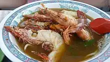 The Penang variant can be easily distinguished from the other variants by its characteristic spicy prawn broth. It primarily consists of rice vermicelli and thicker yellow egg noodles, while the broth is made with prawn heads and shells, and pork ribs.[8] Sliced prawns are also added into the dish, along with pork slices, hard boiled eggs, kangkung (Ipomoea aquatica), bean sprouts, fried shallots, lard and sambal. In Penang, pig skin, an ingredient rarely served in Kuala Lumpur, is a common topping as well.