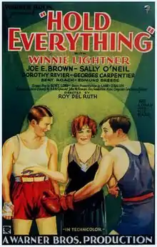Hold Everything is a 1930 American Pre-Code film. It was the first musical comedy film to be released that was photographed entirely in early two-color Technicolor. It was adapted from the DeSylva-Brown-Henderson Broadway musical of the same name that had served as a vehicle for Bert Lahr and starred Winnie Lightner and Joe E. Brown as the comedy duo. The romantic subplot was played by Georges Carpentier and Sally O'Neil. Only three songs from the stage show remained: "You're the Cream in My Coffee", "To Know You Is To Love You", and "Don't Hold Everything". New songs were written for the film by Al Dubin and Joe Burke, including one that became a hit in 1930: "When The Little Red Roses Get The Blues For You". The songs in the film were played by Abe Lyman and his orchestra.