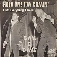 "Hold On, I'm Comin'" (officially registered as "Hold On, I'm Coming",[1] and shown on the original single release as "Hold On! I'm Comin'" and "Hold On! I'm a Comin'")[2] is a 1966 single recorded by soul duo Sam & Dave, issued on the Atlantic-distributed Stax label in 1966.
