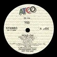 "Hold On" is a song by the progressive rock band Yes, from their 1983 album, 90125. It reached number 43 on the U.S. Mainstream Rock chart in 1984.[1] Later, the live version from 9012Live: The Solos reached number 27 in 1985. [2]