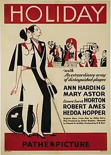 Holiday is a 1930 American pre-Code romantic comedy film which tells the story of a young man who is torn between his free-thinking lifestyle and the tradition of his wealthy fiancée's family. It stars Ann Harding, Mary Astor, Edward Everett Horton, Robert Ames and Hedda Hopper. It was produced and released by Pathé Exchange.
