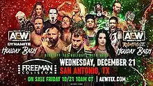 Holiday Bash is an annual Christmas television special produced by All Elite Wrestling (AEW) since 2020. While the original event only aired as a special episode of AEW's flagship program, Wednesday Night Dynamite,[1] the 2021 event expanded it to a two-part event, with the second part airing as a special episode of Rampage, which aired on Saturday instead of its usual Friday.[2] On October 12, 2022, it was announced that the third Holiday Bash would take place on December 21 at the Freeman Coliseum in San Antonio, Texas. Dynamite aired live on TBS while Rampage aired on tape delay on Friday, December 23 on TNT.[3]