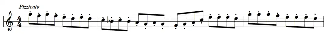 After a short transition setting the pace for the next section, it presents the main theme in pizzicato strings in F Major: