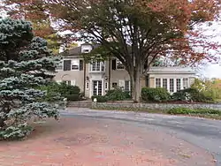 Holladay-Harrington House is a historic estate located at Greenville, New Castle County, Delaware. It was designed about 1927 by noted Delaware architect E. William Martin. It is a 2+1⁄2-story, three bays wide, stuccoed dwelling in the Colonial Revival style. The house has a hipped roof with wide overhanging eaves, projecting pavilion-like side sun porches, and French doors in all three first floor bays. The property includes a contributing garage, three small greenhouses, driveway pillars, fountain and concrete pool, retaining wall, metal fencing with grape design near greenhouses, and landscape features.[2]