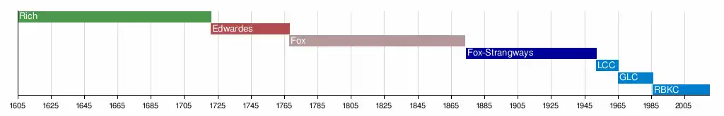 The following timeline depicts the successive ownership of Holland House by the Rich family, Edwardes family, Fox family, London County Council, Greater London Council, and finally Royal Borough of Kensington and Chelsea.