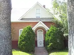 The brick for the house was manufactured by the Buffalo Brick Company, and is laid in a common bond. Red colored stucco placed over the foundations covers about a quarter of the wall on the facade, and the rest of the brick walls. Two double hung windows flank the front entry. Two headers of brock are placed above the windows to form rowlock arches.[2]