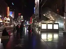The station is in Hollywood on the corner of Hollywood Boulevard and Highland Avenue. Its entrance is inside the Ovation Hollywood shipping complex, on the Hollywood Boulevard side of the building.[2] Pacific Electric Red Car interurban trains stopped on the surface in the early 1900s; this marked the junction of the Hollywood Line with the San Fernando Valley lines to Owensmouth and San Fernando.[3]