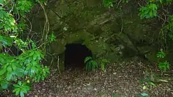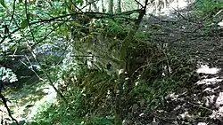 A path from the lodge once led down to an artificial cave cut into soft red sandstone next to the Crawick Water and close to the Soldier's Pool. Locally known as the Witches' Cave, it lay below the old Holm Hunting Lodge.[5] It stands beside a bend in the Crawick Water and the river bank here is protected by a stone wall, now partly collapsed. A stone path and steps run dow to this area from the Holm Walks above. The cave has some features typical of an ice house such as double doors, its location in woodland and the insulation afforded by soft red sandstone. The cave though lacks a deep pit and its role as a game larder is indicated by several large iron nails hammered into the soft red sandstone to hang the game birds, rabbits, deer, etc. until they were matured for cooking. The marks used by the stonemason's tools to create the single chamber can still be clearly seen,especially near the entrance.