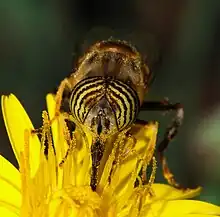 Holoptic refers to one of the ways in which the arthropod eye develops, particularly the eyes of various species of insects. Unlike dichoptic and cycloptic eyes, holoptic eyes meet along the median dorsal line of the head, in many species nearly covering the exterior of the head. Holoptic eyes are typical of several Dipteran males, in particular some Syrphidae, Tabanidae, Pipunculidae, and Acroceridae. Some other insect orders that include species with holoptic males and some in which the females are holoptic as well, include the Coleoptera, Anisoptera, and Archaeognatha.