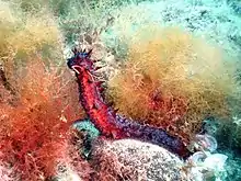 Holothuria tubulosa grows to a length of between 20 centimetres (7.9 in) and 45 centimetres (18 in), and a diameter of 6 centimetres (2.4 in). It is roughly cylindrical with a flattened base on which there are three longitudinal rows of tube feet. It has a tough, leathery skin. The general colour is a shade of brown and the surface is covered with numerous dark-coloured, conical, thorn-like projections known as papillae. It often appears greyish, as it secretes a protective film of mucus to which bits of seaweed and sediment may adhere. It has a fringe of short, flattened tentacles around the mouth at the anterior end and an anus at the posterior end.[3][4]