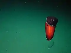 Sea cucumbers can be found in great numbers on the deep seafloor, where they often make up the majority of the animal biomass.[16] At depths deeper than 8.9 km (5.5 mi), sea cucumbers comprise 90% of the total mass of the macrofauna.[17] Sea cucumbers form large herds that move across the bathygraphic features of the ocean, hunting food. The body of some deep water holothurians, such as Enypniastes eximia, Peniagone leander and Paelopatides confundens,[18] is made of a tough gelatinous tissue with unique properties that makes the animals able to control their own buoyancy, making it possible for them to either live on the ocean floor or to actively swim [19] or float over it in order to move to new locations,[20] in a manner similar to how the group Torquaratoridae floats through water.
