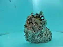 Some species of coral-reef sea cucumbers within the order Aspidochirotida can defend themselves by expelling their sticky cuvierian tubules (enlargements of the respiratory tree that float freely in the coelom) to entangle potential predators. When startled, these cucumbers may expel some of them through a tear in the wall of the cloaca in an autotomic process known as evisceration. Replacement tubules grow back in one and a half to five weeks, depending on the species.[4][33] The release of these tubules can also be accompanied by the discharge of a toxic chemical known as holothurin, which has similar properties to soap. This chemical can kill animals in the vicinity and is one more method by which these sedentary animals can defend themselves.[8]