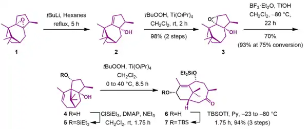 As shown in Scheme 1, the first steps in the synthesis created the bicyclo[5.3.1]undecane AB ring system of Taxol. Reaction of epoxide 1 with tert-butyllithium removed the acidic α-epoxide proton, leading to an elimination reaction and simultaneous ring-opening of the epoxide to give allylic alcohol 2. The allylic alcohol was epoxidized to epoxyalcohol 3 using tert-butyl hydroperoxide and titanium(IV)tetraisopropoxide. In the subsequent reaction, the Lewis acid boron trifluoride catalyzed the ring opening of the epoxide followed by skeletal rearrangement and an elimination reaction to give unsaturated diol 4. The newly created hydroxyl group was protected as the triethylsilyl ether (5). A tandem epoxidation with meta-chloroperbenzoic acid and Lewis acid-catalyzed Grob fragmentation gave ketone 6, which was then protected as the tert-butyldimethylsilyl ether 7 in 94% yield over three steps.
