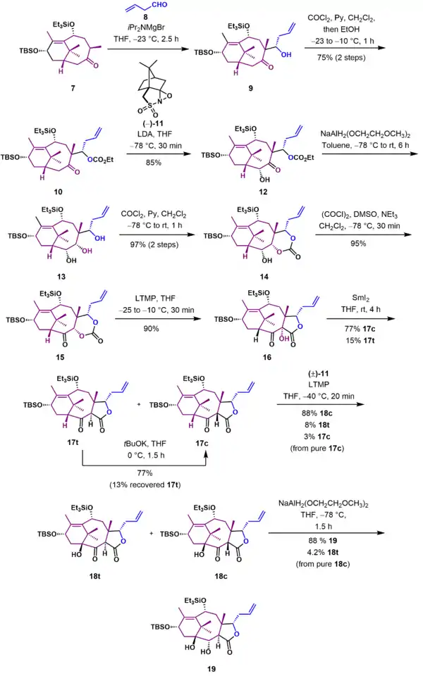 The Holton Taxol total synthesis is a good example of a linear synthesis. The synthesis starts from patchoulene oxide, a commercially available natural compound .[3] This epoxide can be obtained in two steps from the terpene patchoulol and also from borneol.[4][5] The reaction sequence is also enantioselective, synthesizing (+)-Taxol from (−)-patchoulene oxide or (−)-Taxol from (−)-borneol with a reported specific rotation of +- 47° (c=0.19 / MeOH). The Holton sequence to Taxol is relatively short compared to that of the other groups (46 linear steps from patchoulene oxide). One of the reasons is that patchoulene oxide already contains 15 of the 20 carbon atoms required for the Taxol ABCD ring framework.