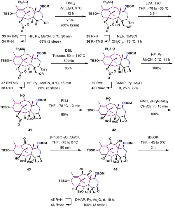 In this section of the Holton Taxol synthesis (Scheme 4), the oxetane D ring was completed and ring B was functionalized with the correct substituents. Allylic alcohol 34, obtained from deprotection of silyl enol ether 33 with hydrofluoric acid, was oxidized with osmium tetroxide in pyridine to give triol 35. After protection of the primary hydroxyl group, the secondary hydroxyl group in 36 was converted to a good leaving group using p-toluenesulfonyl chloride. Subsequent deprotection of the trimethylsilyl ether 37 gave tosylate 38, which underwent cyclization to give oxetane 39 by nucleophilic displacement of the tosylate that occurred with inversion of configuration. The remaining unprotected tertiary alcohol was acylated, and the triethylsilyl group was removed to give allylic alcohol 41. The carbonate ester was cleaved by reaction with phenyllithium in tetrahydrofuran at -78 °C to give alcohol 42. The unprotected secondary alcohol was oxidized to ketone 43 using tetrapropylammonium perruthenate (TPAP) and N-methylmorpholine N-oxide (NMO). This ketone was deprotonated with potassium tert-butoxide in tetrahydrofuran at low temperature and further oxidized by reaction with benzeneseleninic anhydride to give α-hydroxyketone 44. Further treatment of 44 with potassium tert-butoxide furnished α-hydroxyketone 45 through a Lobry-de Bruyn-van Ekenstein Rearrangement. Substrate 45 was subsequently acylated to give α-acetoxyketone 46.