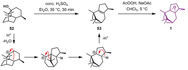 Patchoulene oxide (1) could be accessed from terpene patchoulol (52) through a series of acid-catalyzed carbocation rearrangements proceeded by an elimination following Zaitzev's rule to give pathoulene (53). The driving force for the rearrangement is relief of ring strain. Epoxidation of 53 with peracetic acid gave patchoulene oxide 1.