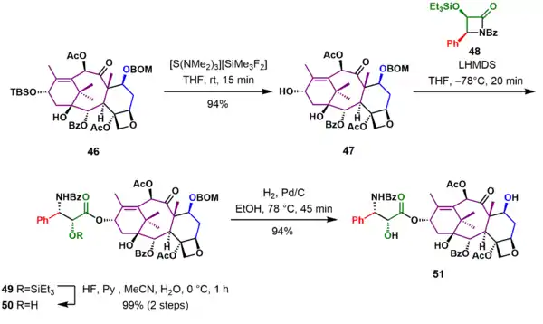 In the final stages of the synthesis (Scheme 5), the hydroxyl group in 46 was deprotected to give alcohol 47. Reaction of the lithium alkoxide of 47 with the Ojima lactam 48 adds the tail in 49. Deprotection of the triethylsilyl ether with hydrofluoric acid and removal of the BOM group under reductive conditions gave (−)-Taxol 51 in 46 steps.