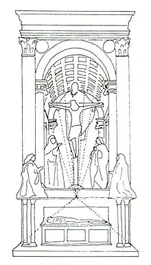 The Trinity is noteworthy for its inspiration taken from ancient Roman triumphal arches and the strict adherence to recently developed perspective techniques, with a vanishing point at the viewer's eye level,[5] so that, as Vasari describes it "a barrel vault drawn in perspective, and divided into squares with rosettes that diminish and are foreshortened so well that there seems to be a hole in the wall."[6] This artistic technique is called trompe-l'œil, which means "deceives the eye," in French. The fresco had a transforming effect on generations of Florentine painters and visiting artists. The sole figure without a fully realized three-dimensional occupation of space is the God supporting the Cross, considered an immeasurable being. The kneeling patrons represent another important novelty, occupying the viewer's own space, "in front of" the picture plane, which is represented by the Ionic columns and the Corinthian pilasters from which the feigned vault appears to spring; they are depicted in the traditional prayerful pose of donor portraits, but on the same scale as the central figures, rather than the more usual 'diminution', and with noteworthy attention to realism and volume.