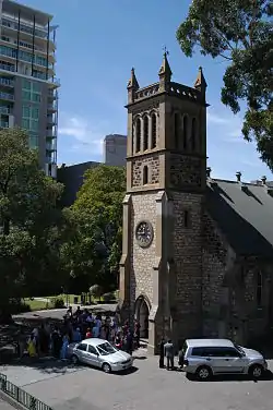 The church was built in three main stages. It was originally planned that the church would be a prefabricated building imported from England;[2] however, when the prefabricated building arrived from England badly damaged, it was decided instead to build a stone church, Henry J. Moseley the builder.[3] Governor Hindmarsh laid the foundation stone on 28 January 1838 and the church opened in about August that year, within two years of the settlement of Adelaide (see History of Adelaide). The building quickly became a landmark with its "peaked cap" top tower and the Vulliamy clock. (Benjamin Lewis Vulliamy 1780–1854, was the clockmaker to King William IV and Queen Adelaide.[4])