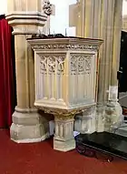 Holy Trinity is a typical Victorian era church built in 1867 by William White on the site of an earlier church designed in the 1840s by David Mackintosh of Exeter[2] but which necessarily had to be rebuilt as its foundations were unsound. The four-stage tower with set-back buttresses is built in the Somerset style and pre-dates the main body of the present church having been constructed between 1843 and 1845 as part of the earlier church; at 38 metres high the tower is the main reason for the Grade II* listing and is a landmark around Barnstaple and surrounding areas.[3] The tower has an embattled and pierced parapet with corner pinnacles with crockets and lower, central pinnacles to each face and is constructed of rubble with tooled ashlar dressings. The rest of the church is built with snecked stone with ashlar and Bath stone dressings with good carved friezes on the exterior of the nave and tower while the roof is slate. The iron railings and gates at the west end of the tower with an unpierced cast-iron frieze of foliage design also form part of the listing status.[1]