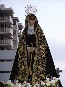 - Sección de Damas de la Virgen de la Esperanza: Its 1,000 female and 200 male members accompany the statue of the Virgin on Maundy Thursday. The ladies, dressed in mourning clothes with Spanish haircombs or 'peinetas' and 'mantillas'. The men, in satin white robe and 'caperuzo' with green cape. Founded in 1960.