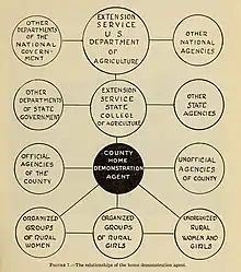 Home demonstration agents were considered to be the local representatives of individual states' county extension services and of the USDA.[17] They were employed to teach different skills inside of the home, outdoors or in the community.[18] Home demonstration agents were required to have at least a bachelor's degree in home economics, although that requirement had been waived in the past.[19][20] Home demonstration agents would work with clubs by making home visits.[5] Agents also had office hours, wrote articles, conducted workshops and lectures, and had office hours.[5] Agents felt that their jobs were to provide information, but not to provide "judgment."[12] Agents, especially ones working black communities, understood the importance of building a rapport with their communities and worked to gain trust.[21]