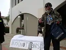 The criminalization of homelessness can be defined as the passage of laws or ordinances that prohibit sitting, sleeping, panhandling, sharing food, or religious practice in public spaces.[2] Over half a million people are homeless on any given night in the United States, and a third of them are unsheltered.[6] The growing issue of homelessness has been met with increasingly strict homeless legislation that seeks to reduce the visibility of unhoused individuals.[1] These measures penalize individuals from performing necessary, life-sustaining practices (such as sleeping) outside of the private domain, and disproportionately impact unhoused populations who have no choice but to occupy public space for these activities.[3]