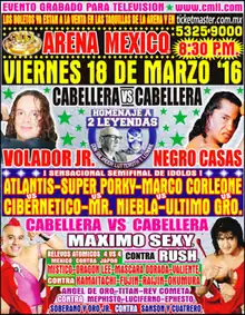 On September 11, 2015 Ramón Ibarra Banda, better known as Super Parka returned to CMLL after an almost eight-year absence to team with his son Volador Jr.[5] A couple of months later Super Parka began working a storyline feud against Negro Casas, one of CMLL's resident veteran rudos. The story line eventually led to the two captaining a team of three, facing off during the 2015 Infierno en el Ring. Super Parka teamed with Máximo Sexy and Valiente while Casas teamed up with Kamaitachi and Bárbaro Cavernario. After Super Parka's team won the match both Super Parka and Casas laid out a Lucha de Apuestas challenge, daring each other to put their hair on the line for a special "bet match" between the two. Moments later CMLL officials came to the ring to sign the contract for the following week's Sin Piedad ("No Mercy") show.[6][7] Casas defeated Super Parka, forcing Super Parka to have all his hair shaved off as a result.[8][9] Casas' nephew Puma helped his uncle win the match, much to the displeasure of Volador Jr. who was in his father's corner. Volador Jr. vowed to get revenge for what he described as the Casas family's cheating ways. The first time Volador Jr. faced off against Negro Casas after Sin Pieda Puma and his brother Tiger interfered in the match, helping their uncle win the match. The story line between Volador Jr. and Negro Casas led to Volador Jr. defending the NWA World Historic Welterweight Championship against Negro Casas on February 15, 2016. On February 24 CMLL held a press conference where Volador Jr. and Negro Casas both agreed to put their hair on the line in a Lucha de Apuestas match, officially announcing the main event of the 2016 Homenaje a Dos Leyendas show.[10]