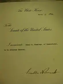 Following the election, Roosevelt chose Cummings as governor-general of the Philippines. Two days before the inauguration, Thomas J. Walsh, who had been designated attorney general, died. Upon taking office on March 4, 1933, Roosevelt named Cummings to lead the Justice Department. Cummings served almost six years as attorney general.[3] Only William Wirt (1817–1829), Janet Reno (1993–2001), and Eric Holder (2009–2015) have had longer tenures in the position.