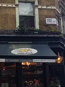 In its early days, Homer Street had shops and businesses on the ground floor of many buildings. Whilst some shop fronts have since disappeared, two of Marylebone's old pub buildings remain. The Olive Branch at the corner with Crawford Street is now Italian restaurant Bricioli, and halfway down the street, The Beehive is currently being renovated. The Beehive narrowly escaped demolition linked to St Marylebone Council's slum clearance programme in 1956, when the Freshwater Place/Homer Row scheme was cut back to exclude properties fronting Homer Street.[21] The Olive Branch's 1988 reincarnation as The Quintin Hogg earned a wry put-down from Alan Coren in The Times Diary: 'Where will it end? Are we soon to have The Dog and Tebbit, or The Two Jolly Kinnocks?'[22] Typically for the urban village it's part of, Homer Street is home to long-term residents and young professionals alike.