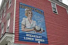 The huge mural that is painted on the street-facing side of the restaurant's facade is an iconic view in the city. Showcasing a blonde-haired waitress in old-fashioned garb holding a steaming bowl of grits, the mural aptly bears the slogan "grits are good for you," in a style that emulates World War II era propaganda.[12]