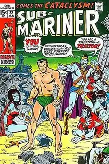 ![]() A group of Atlantean Homo mermani berate Namor the Sub-Mariner on the cover to Sub-Mariner #33. (Art by Sal Buscema). | |
