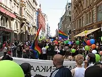 The 2010 Helsinki Pride week organized by HeSeta, Helsinki branch of Finnish LGBT rights organization Seta, culminated in the June 3 pride parade which was targeted with a pepper spray attack.[28] The same day, the police took three men, two 18-year-olds and one 20-year-old, into custody suspected of the attack and the police considered the attack "premeditated".[29] The Security Police later stated that some of the suspects have links to radical right groups.[30] On June 7, Helsinki District Court detained the three suspected of assault, violation of political freedom and prevention of a public meeting.[30] In the Finnish Criminal Code, "directing of the offence at a person belonging to a national, racial, ethnic or other population group due to his or her membership in such a group"[3] is an aggravating circumstance in sentencing. On March 1, 2011, the State Prosecutor pressed charges against the three with the abovementioned, suspected actions and possession of an object or substance suitable for injuring another person.[31]