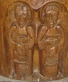 Stuart works with other materials but favours wooden carvings, as exemplified by those at the front of the Honan altar.[52] Her replacement altar, constructed in oak, depicts two of the Evangelists.[49] Being movable, it allowed clergy and attendants to be closer to the congregation.[50] Although the altar was first intended for the centre of the chancel at the focal point of the mosaic floor, this arrangement proved to be too far back and was impractical during ceremonies.[53]