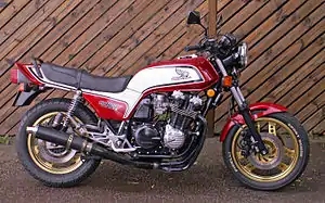 In 1983 Honda released the CB1100F, based on the CB900F and the CB1100R. Besides a distinctive-to-the-1100f paint scheme, it used hotter cams, larger pistons, better carburetion in the form of four Keihin 34 mm CV, and a redesigned combustion chamber. The CB1100F produced 108 bhp @ 8500 rpm. It also had increased rake and the dash featured a 150 mph or 240 km/h speedometer and adjustable two-piece handlebars. The tubeless-tire wheels were new also, 18-inch x 2.50-inch front and 17-inch x 3-inch rear.[2] Performance was pace setting. Cycle World tests at 11.13 seconds/120.48 mph quarter mile and 141 mph half mile earned it the designation of "fastest stock bike ever tested".[3]