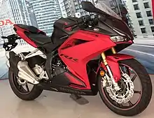 The Honda CBR250RR is a CBR series 250 cc (15 cu in) twin-cylinder sport bike made by Astra Honda Motor, a subsidiary of Honda in Indonesia.[8] It was unveiled in July 2016 in Jakarta.[9] Production was started in November of the same year for the 2017 model year.[10] It is the first CBR motorcycle to have a twin-cylinder engine on RR moniker. It is also the smallest Honda motorcycle to wear a CBR-RR badge. Previously, Honda also used the "CBR250RR" name for their four-cylinder sport bike sold between 1990 and 1996. The bike is officially sold in Indonesia, Japan, Hong Kong, Macau, Thailand, and Malaysia.[11][12]