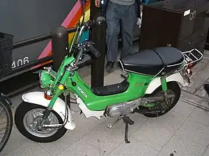 The Chaly was officially released in Japan on July 18, 1972. Three versions were released the same year under the names 50-I CF, 50-II CF and 70 CF (the numbers determine the displacement 49 cm3 and 72 cm3).[1] In light of article R 311-1 of the French Highway Code of 30 April 2009, depending on whether it is equipped with a 50 cm3 or 70 cm3 engine, this two-wheeler is a moped or a light motorcycle.[2]