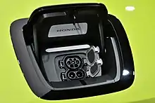 A 35.5 kWh lithium-ion battery pack is claimed to offer a range of around 220 km (140 mi) as per Honda internal data.[20] The e is equipped with a CCS Combo 2 connector, enabling both AC charging and DC fast charging.[16] With DC fast charging, the car can be charged to 80% capacity in 30 minutes.[14] Honda has also announced the pending availability of its Power Charger, which allows a charging power of up to 7.4 kW (single-phase). Three-phase charging (22 kW) is not available. With a 7.4 kW charger, the vehicle will charge to 100% capacity in approximately 4 hours.[23]