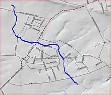The Honey Branch starts at 40°22′15″N 74°46′6″W.[1] It flows southeast, crossing Moores Mill Mt. Rose Road. It then turns east and flows across Pennington-Rocky Hill Road. It picks up several tributaries and drains into the Stony Brook Fourteen Basin. After the basin, it crosses Elm Ridge Road and drains into the Stony Brook at 40°20′17″N 74°44′29″W,[1] near Rosedale Park.