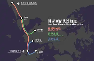 Hong Kong–Shenzhen Western Express Railway (Chinese: 港深西部快速軌道) is a proposed cross-border railway offering three future distinct services, direct connection between Hong Kong International Airport (HKIA) and Shenzhen Bao'an International Airport; cross-border service between Hung Shui Kiu and Qianhai; and domestic service between Tuen Mun and Siu Ho Wan.