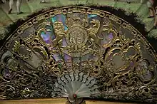 The motto in Anglo-Norman, a dialect of Old Norman French spoken by the medieval ruling class in England, appears in the late 14th century Middle English poem Sir Gawain and the Green Knight as hony soyt qui mal pence, at the end of the text in the manuscript, albeit in a later hand. The poem is connected to the Order of the Garter.[6][7] In the poem, a girdle, very similar in its erotic undertones to the garter, plays a prominent role. A rough equivalent of the Order's motto has been identified in Gawain's exclamation corsed worth cowarddyse and couetyse boþe ("cursed be both cowardice and coveting", v. 2374).[8] While the author of the poem remains disputed, there seems to be a connection between two of the top candidates and the Order of the Garter, John of Gaunt, and Enguerrand de Coucy, seventh Sire de Coucy. De Coucy was married to King Edward III's daughter, Isabella, and was admitted to the Order of the Garter on their wedding day.[9]