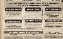 Honoré N. Razafindramiandra (23 August 1939 - 29 April 1996) was a Malagasy politician. Born in Ampitatafika, Antanifotsy, he was an activist of the Vital Forces Committee known as Commité des Forces Vives. He served as Vice-President of the Forces Vives Committee in 1991 and as Vice-President of the High State Authority under the Transitional Government until 1993. Founder of the Political party Accord (Actions des Chrétiens Cadres et Opérateurs de tous les Régions pour le Développement) and Director and founder of two National weekly newspapers Ala-Voly and Confidences au Sommet. Honoré N. Razafindramiandra was an Alma mater of Institut d'études politiques de Paris and graduated from the Public Service Division in 1965. He was awarded the National Order of the Legion of Honour. He served as Minister of Culture, Communications and Recreation of the Republic of Madagascar until his death on April 29, 1996.[1]