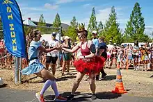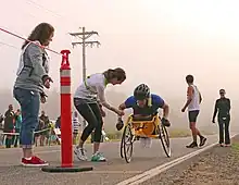 Wheeled athlete coming into exchange point in Mist, Oregon