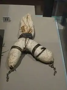 In Darrow, Louisiana at the Ashland-Belle Helene Plantation historians and archeologists unearthed Kongo and Central African practices inside slave cabins. Enslaved Africans in Louisiana conjured the spirits of Kongo ancestors and water spirits by using seashells. Other charms were found in several slave cabins, such as silver coins, beads, polished stones, bones, and were made into necklaces or worn in their pockets for protection. These artifacts provided examples of African rituals at Ashland Plantation. Slaveholders tried to stop African practices among their slaves, but enslaved African Americans disguised their rituals by using American materials and applying an African interpretation to them and hiding the charms in their pockets and making them into necklaces concealing these practices from their slaveholders.[112] In Talbot County, Maryland at the Wye House plantation where Frederick Douglass was enslaved in his youth, Kongo related artifacts were found. Enslaved African Americans created items to ward off evil spirits by creating a Hoodoo bundle near the entrances to chimneys which was believed to be where spirits enter. The Hoodoo bundle contained pieces of iron and a horse shoe. Enslaved African Americans put eyelets on shoes and boots to trap spirits. Archaeologists also found small carved wooden faces. The wooden carvings had two faces carved into them on both sides which were interpreted to mean an African American conjurer who was a two-headed doctor. Two-headed doctors in Hoodoo means a conjurer who can see into the future and has knowledge about spirits and things unknown.[113]